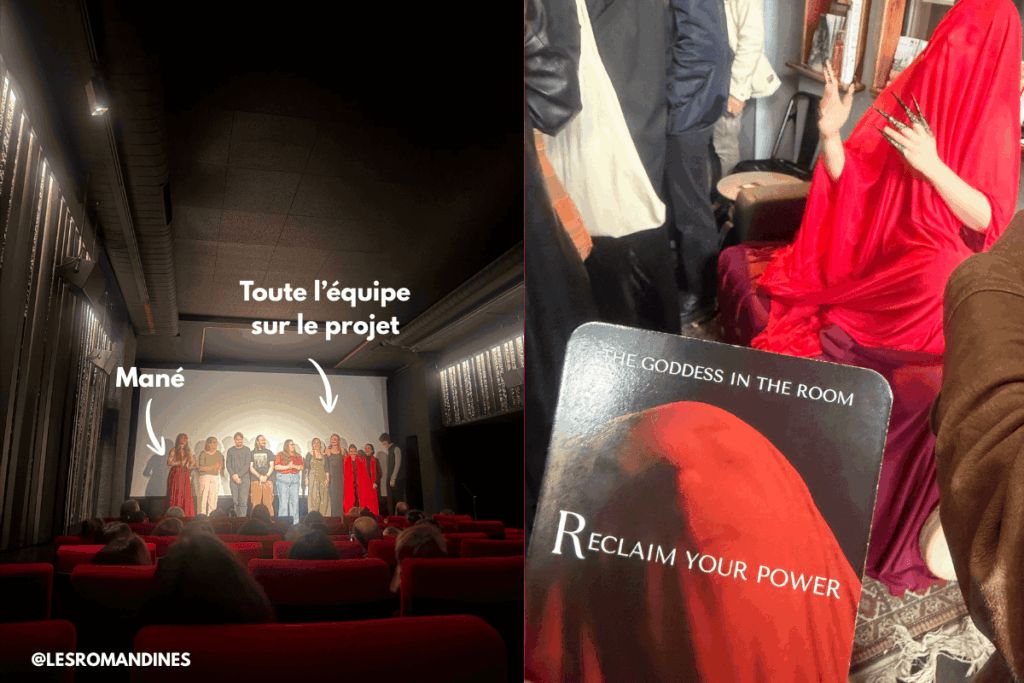 Dès l’entrée au Cinéma de Bellevaux, le ton est donné : une atmosphère mystérieuse et chamanique enveloppe les invité·e·s. Accueilli·e·s avec une carte d’oracle à tirer, nous sommes plongé·e·s dans un univers soigneusement scénographié. L’équipe de Mané, vêtue de tissus rouges soyeux, sert une boisson dans une ambiance presque rituelle, avant de nous guider dans une méditation collective.